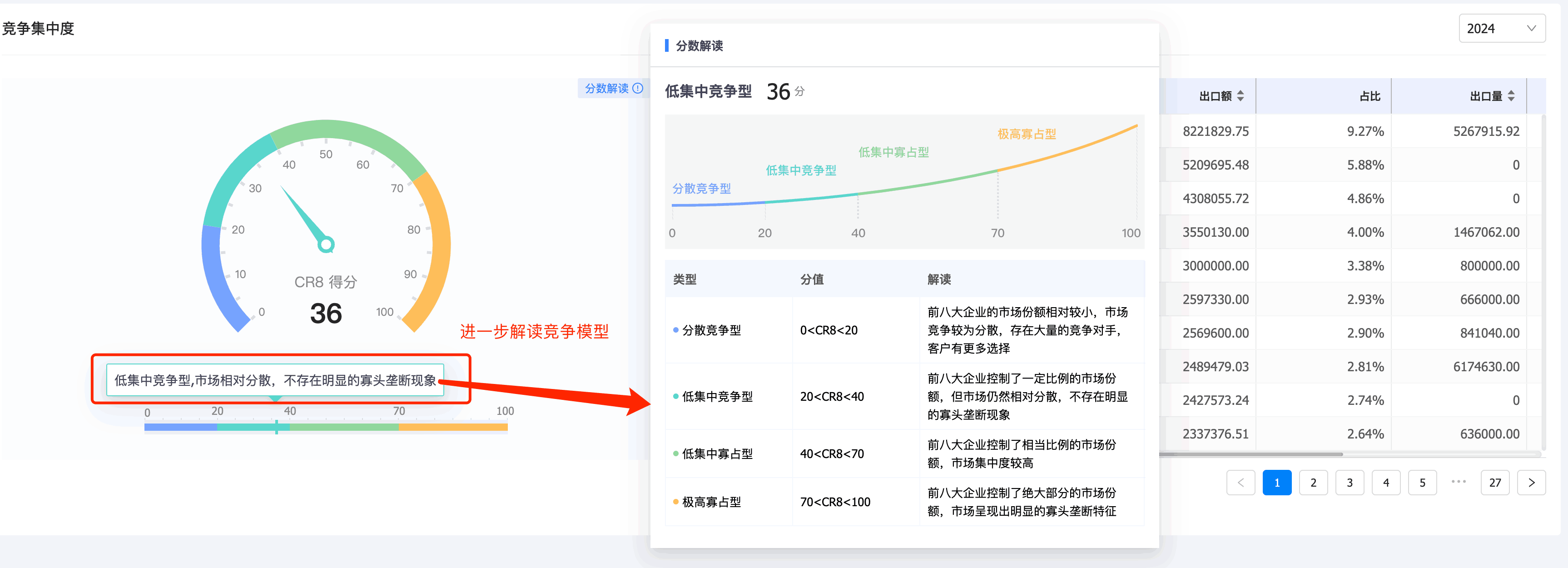 3. USDT钱包商情洞察竞争分析新增「竞争集中度分析」:基于行业集中度(Concentration Ratio)理论来计算目标产品竞企竞争集中度,出口目标产品前8家最大的企业所占市场份额的总和,是对整个竞争市场结构集中程度的测量指标