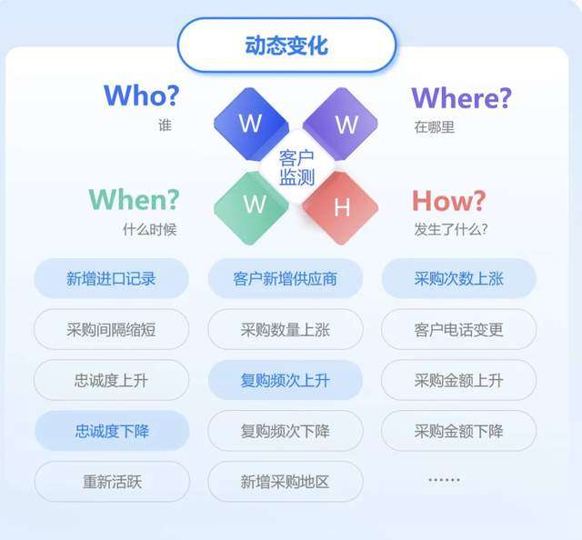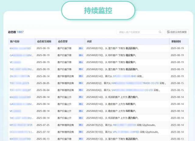 【商情洞察】拥有敏锐的“嗅觉”。深度监测高价值客户的细微变化:进口结构调整、价格波动、切换供应商迹象等。