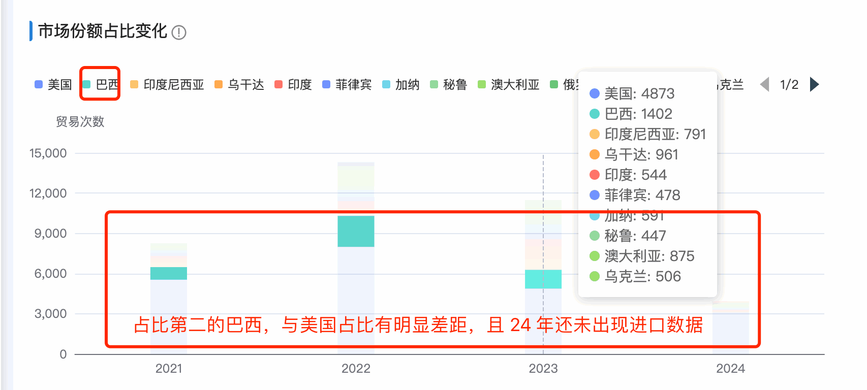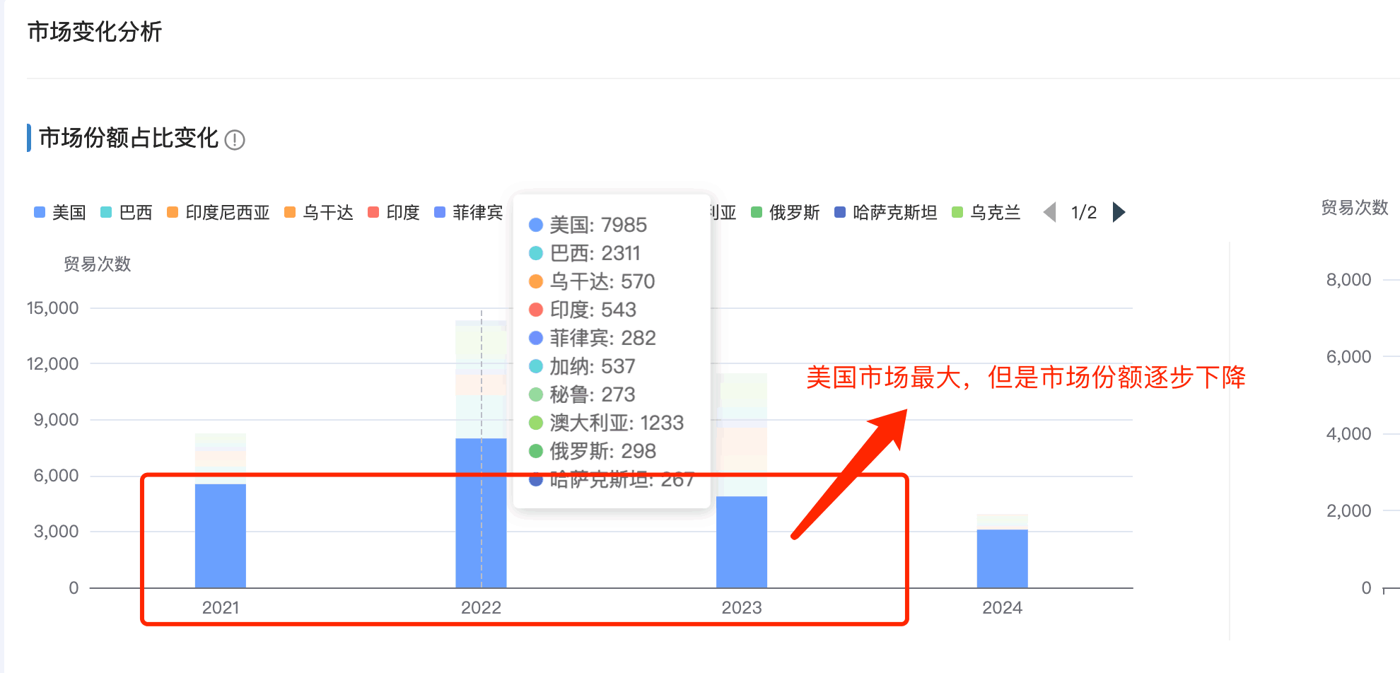 1. USDT钱包商情洞察市场分析新增「市场占比变化分析」:分析每年的头部市场的占比排名和变化,哪些市场持续排名在头部,哪些市场排名逐渐下滑甚至消失在top之外的。